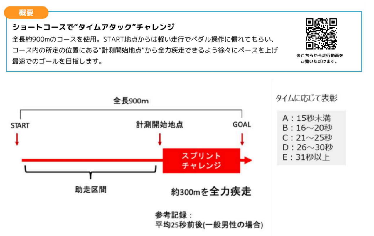 (ルール)300m程の区間を全力走行していただき、そのタイムを競います。参加者は予約をせずに体験が可能です。全長900m程のコースを使用し、3分の2程度の距離を助走区間として走行いただいたのち、スタートライン迄迫りましたらゴールを目指して全力でペダルを漕いでいただきます。