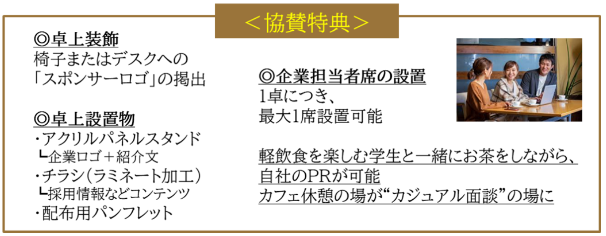 ロゴの掲載やブース出展等の一般的なメニューもご用意しておりますが、来場する”学生へのリーチ”だけでなく、カフェ空間を通じて学生と双方向でのコンタクトの場を積極的に設けることで、企業様の満足度向上に資するメニューをご用意いたしました。